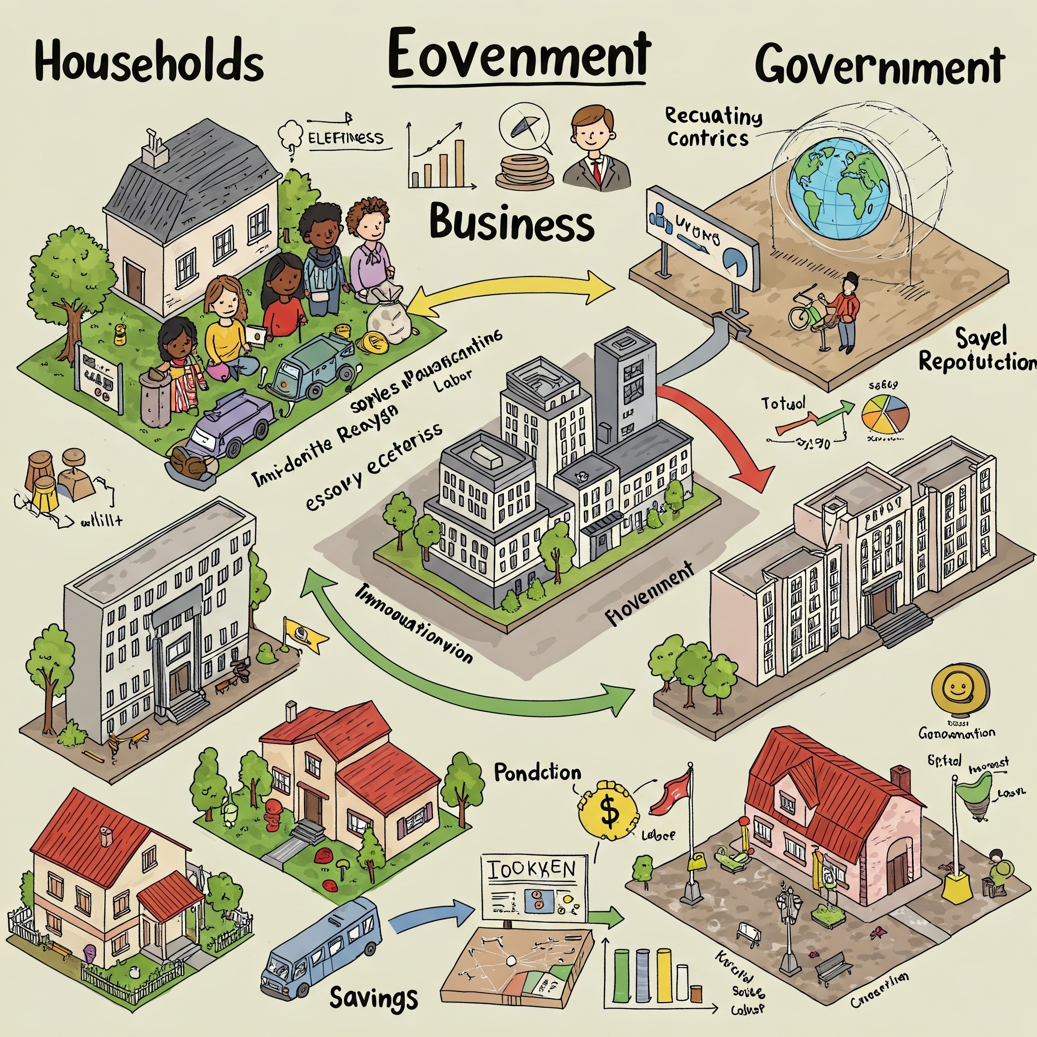가계는 기업에 노동을 제공하고, 기업은 가계에 임금을 지급한다. 가계는 기업이 생산한 재화와 서비스를 구매하고, 기업은 가계로부터 수익을 얻는다. 정부는 가계와 기업으로부터 세금을 징수하고, 이를 통해 공공재를 제공하거나 재정 정책을 수행한다. 이 세 가지 경제 주체는 서로 상호작용하며 경제 활동을 한다.