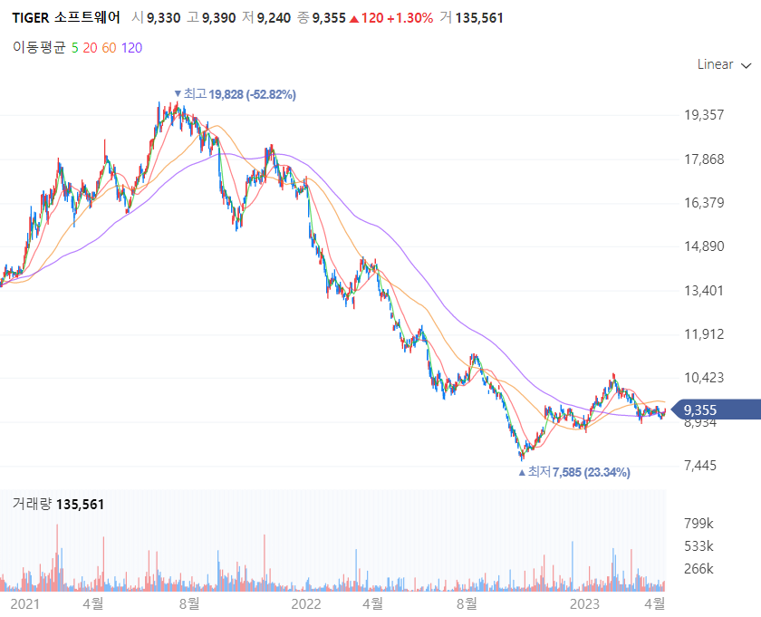 TIGER소프트웨어는 가장 많은 투자금이 들어갔고 몇 번의 물타기 기회가 있어서 지속적으로 매달 매입 하였으나 아주 많이 무너진 종목으로 2023년 4월 기준으로 이 종목은  - 47% 가 되었다. 카카오와 네이버의 비중이 매우 크고 고점에서 자금을 매우 많이 투입했다. 아주 아픈 종목으로 퇴직까지 그냥 존버하려 한다. KOSEF 국고채 10년은 수익률을 회복 중이다.